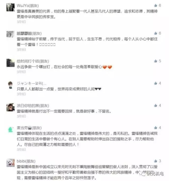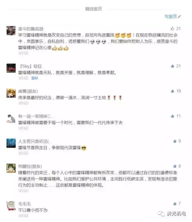 多少年来,雷锋精神鼓舞着一代又一代人。雷锋精神究竟是什么,每个人内心都有一个答案。除了以上的系列活动,机电系还推出线上活动--“谈谈你心中的雷锋精神”。在这个意义非凡的日子里,同学们都说出了自己心中的雷锋精神。