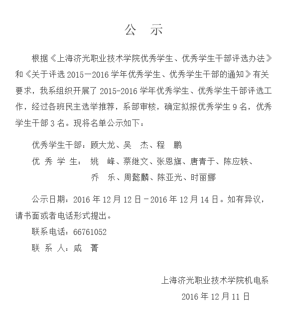 机电系拟报2015-2016学年校级优秀学生、优秀学干名单