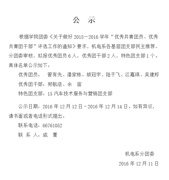 机电系拟报2015-2016学年校级优秀团员、优秀团干部名单