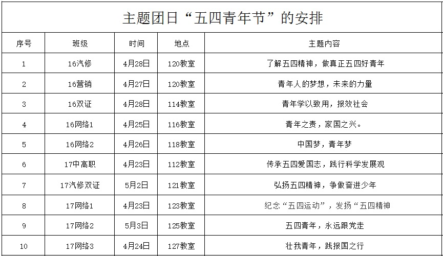 为纪念建团96周年暨“五四”爱国运动99周年,继承和弘扬伟大的“五四”精神,坚定团员青年爱国、爱党、爱团的理想信念,引导团员青年增强历史责任感和时代使命感,机电系各团支部于2018年4月23日―5月3日积极开展“坚定理想信念--五四主题团日”活动。