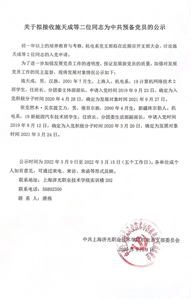 关于拟接收施天成等二位同志为中共预备党员的公示