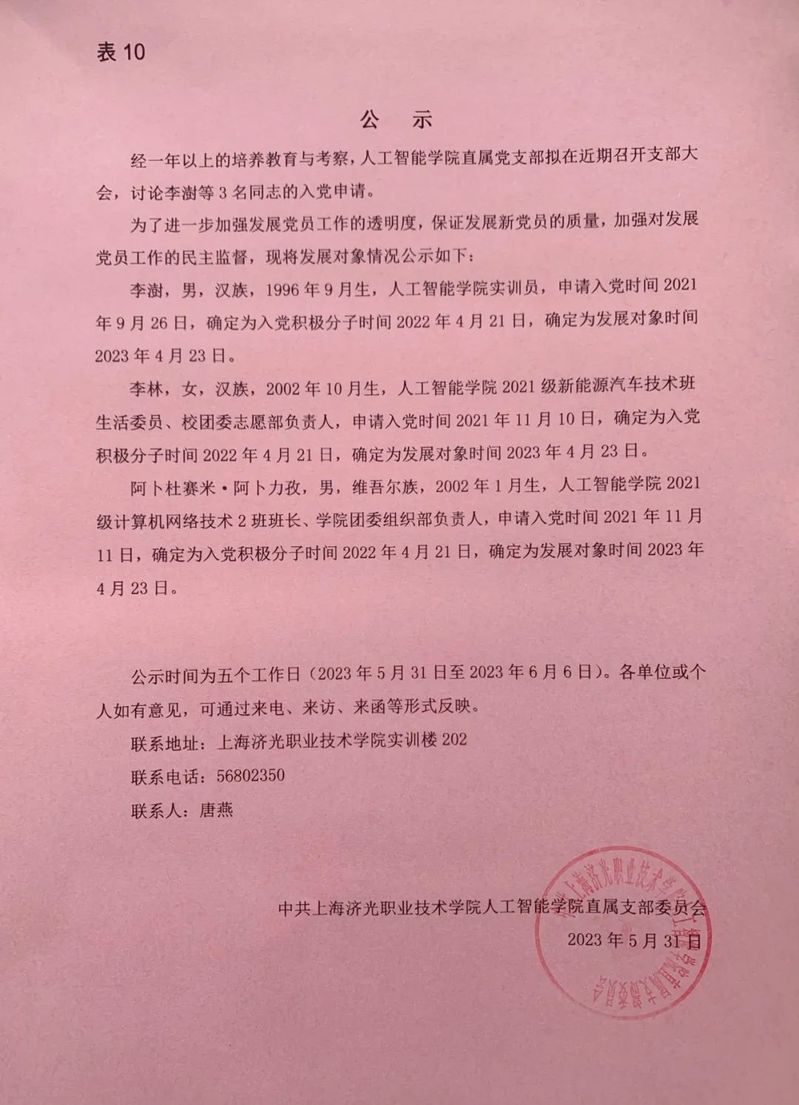 人工智能学院拟发展李澍等三位同志为中共预备党员的公示