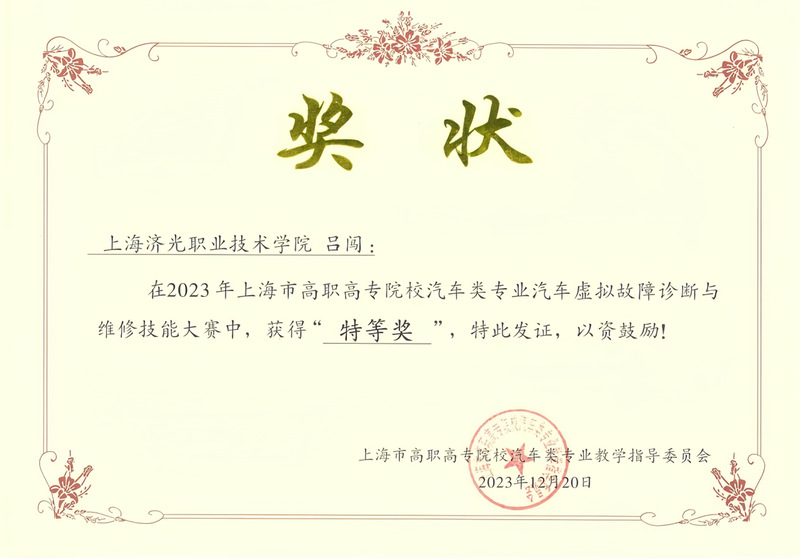 上海济光职业技术学院学院人工智能学院2022级新能源汽车技术2班学生吕闯,在2023上海市高职高专院校汽车类专业学生创新比赛-汽车虚拟故障诊断与维修技能大赛中获特等奖,他以精湛的技能和执着的追求,彰显了新时代青年学子的匠人风采。
