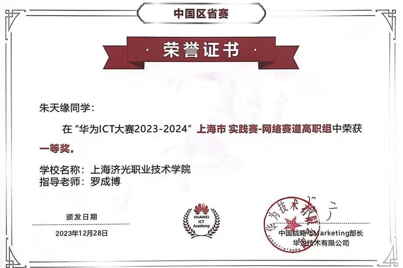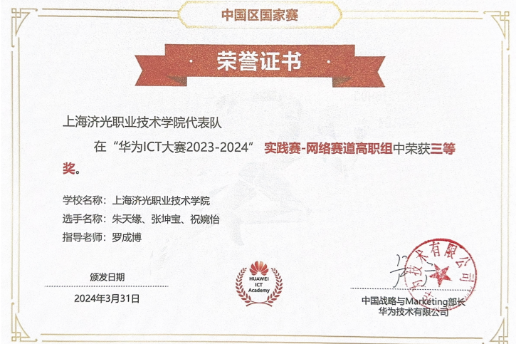 近日,华为ICT大赛2023-2024中国区国家赛实践赛决赛落幕,在我院罗成博老师的指导下,朱天缘、张坤宝、祝婉怡三位同学喜获 “华为ICT大赛2023-2024”中国区国家赛-网络赛道高职组三等奖。